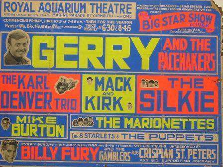 Moving on to Great Yarmouth towards the end of May, I’m celebrating my 22nd birthday, AND in rehearsals for ‘The Big Star Show of 1966’ which was to run for the summer season in this fabulous town. The bill was Gerry & the Pacemakers, The Karl Denver Trio, The Silkie, The Marionettes, Mack and Kirk, Mike Burton, The Puppets, and, of course, The 8 Starlets.