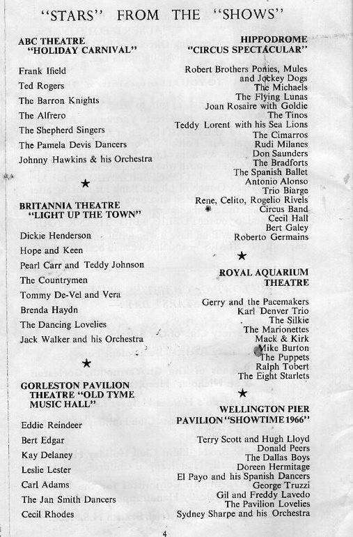 There were ‘show business’ people everywhere in Great Yarmouth that year, a happening town indeed! Besides Gerry and the Pacemakers, The Karl Denver Trio, The Puppets et al, at The Royal Aquarium Theatre. There was Terry Scott & Hugh Lloyd, Donald Peers, and The Dallas Boys at The Wellington Pier. Dickie Henderson, Hope & Keen, and Pearl Carr & Teddy Johnson at The Britannia Theatre, and Frank Ifield, Ted Rogers and The Baron Knights at the ABC. A few ‘biggies’ there for the time!