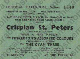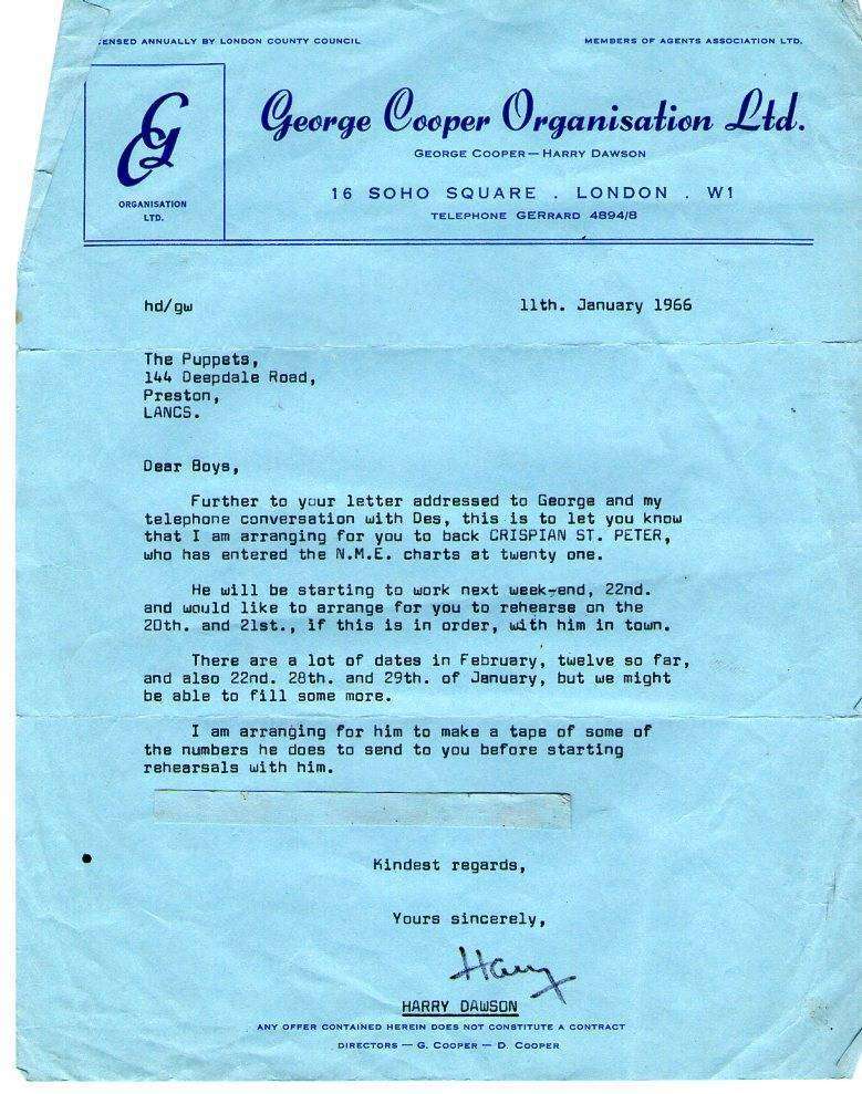 Back home to Preston for Xmas and then in January 1966 we were introduced to Crispian St. Peters. We were advised by the George Cooper Organisation that Crispian had entered the New Musical Express national charts at No. 21 and that ‘he was starting to work next weekend’, (22nd. Jan), and it had been arranged for us to become his backing group and we were to rehearse with him on the 20th and 21st. Wow!! Two day’s for rehearsals… TWO DAYS!!!! By the time we did the first gig with him on Jan 22nd he was already TOP TEN!! Then, only 11 days after meeting Crispian we found ourselves playing with him LIVE on the BBC’s ‘Saturday Club’ with Brian Matthew, on January 31st. His first hit was ‘You Were On My Mind’ which got to No. 2, and he followed that up with ‘Pied Piper’ which went to No. 1!!! Wow!!