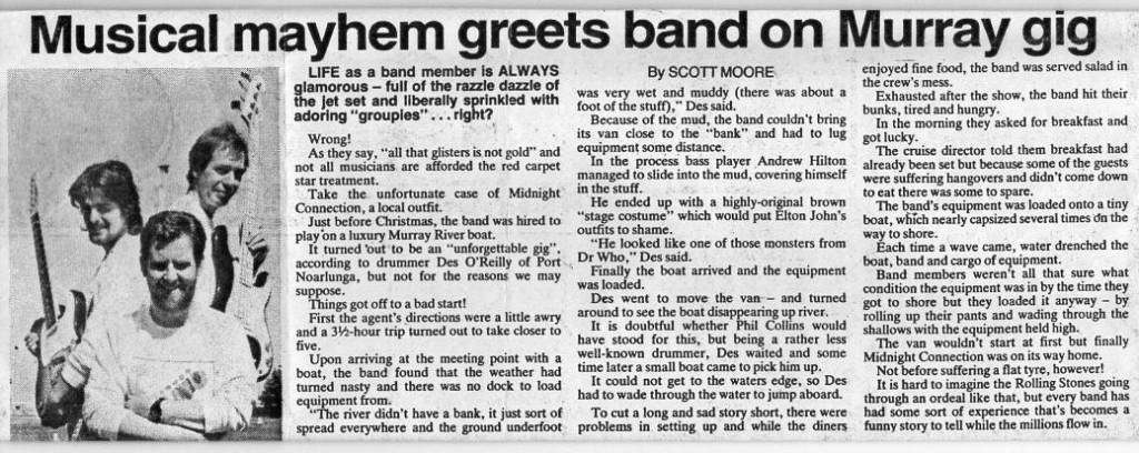 Andrew, on bass and vocals, and myself on drums and vocals, originally started playing as a three piece, with either a pick-up guitarist or keyboard player, around 1983, continuing on as Midnight Connection. Here’s a little story of one of the things that happened on a gig we did on the River Murray paddle steamer, The River Murray Queen.
